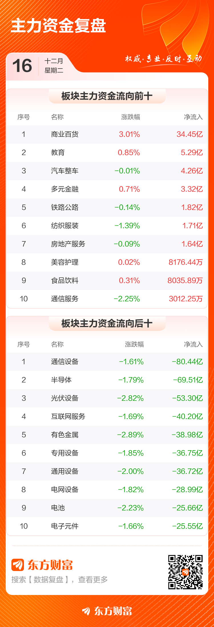 12月16日,沪指跌1.11%,深成指跌1.51%,创业板指跌2.1%。两市成交额1.72万亿,较上个交易日缩量493亿。数据显示,今日大盘主力资金净流出828.77亿。商业百货、教育、汽车整车等板块主力资金流入排名居前,其中商业百货净流入34.45亿元。