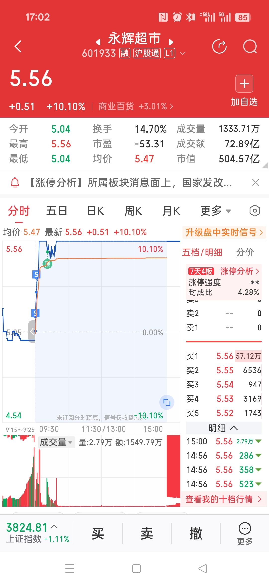 #炒股日记# 卖飞了,早盘竞价它和永辉都是炒预期,一个冲高回落,一个烂板差一档。今天开平盘就是超预期,加上百大封死涨停,但是昨天是东百主动和强势带着永辉,又被昨天永辉挂得1亿卖单骗了。今天把仓位都移到东百去了,没想到今天永辉强势主动上板。
