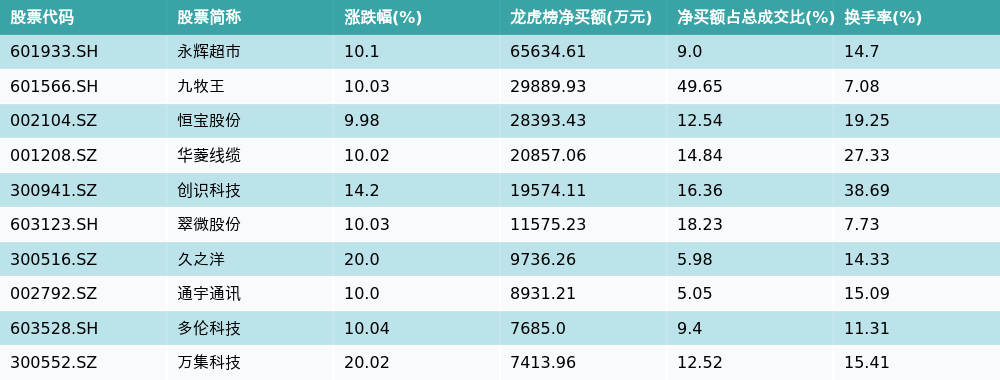 南财智讯12月16日电,南财金融终端数据显示,因当日异动登上龙虎榜的个股中,资金净买入最多的前三位分别是永辉超市(601933.SH)、九牧王(601566.SH)与恒宝股份(002104.SZ)。其中排名第一的永辉超市净买额达6.56亿元,占总成交金额的9.0%。永辉超市当日收盘上涨10.1%,换手率为14.7%,净买入额前10个股详情见下图: