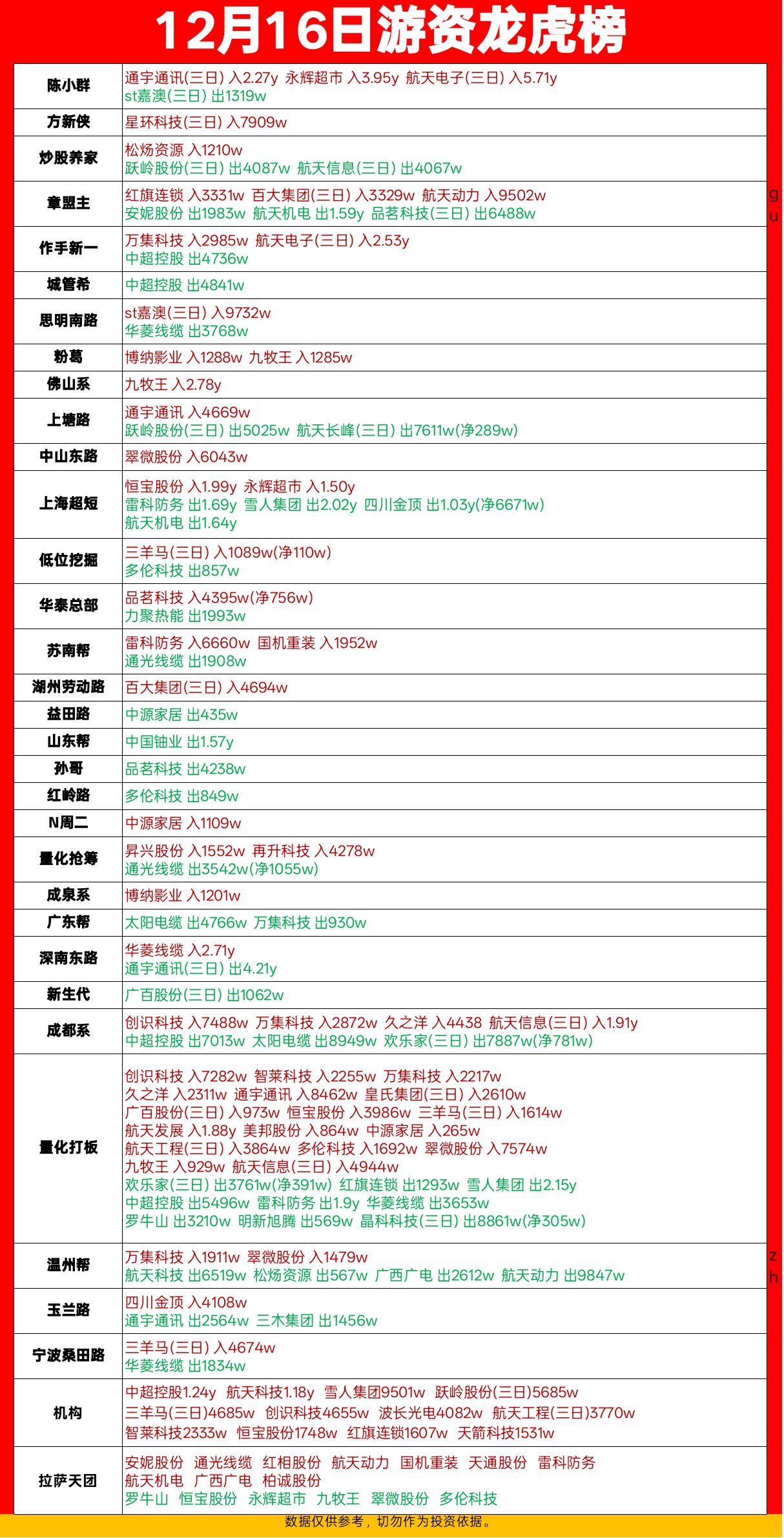 12.16游资龙虎榜,陈小群章盟主方新侠上榜。