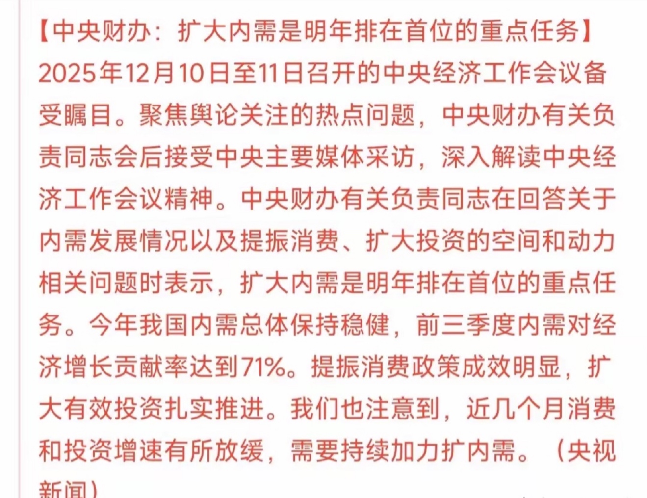 央视新闻聚焦扩内需,该举措被明确为明年核心任务,此前已上升至战略高度,政策重视程度空前。