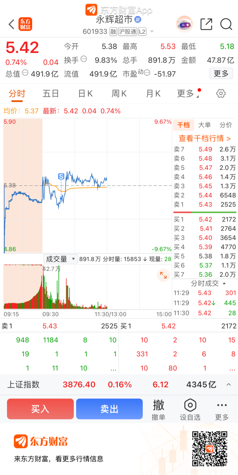 $永辉超市(SH601933)$ 早上最高点没走,我真是