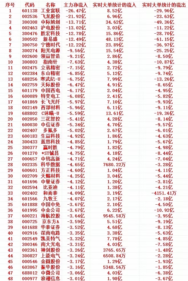 榜单中工业富联(-26.47 亿)、飞龙股份(-21.92 亿) 净流出超 20 亿元,处于第一梯队;中际旭创、沪电股份等多只个股净流出在 10-20 亿元区间,属于第二梯队;其余多数个股净流出集中在 3-10 亿元。