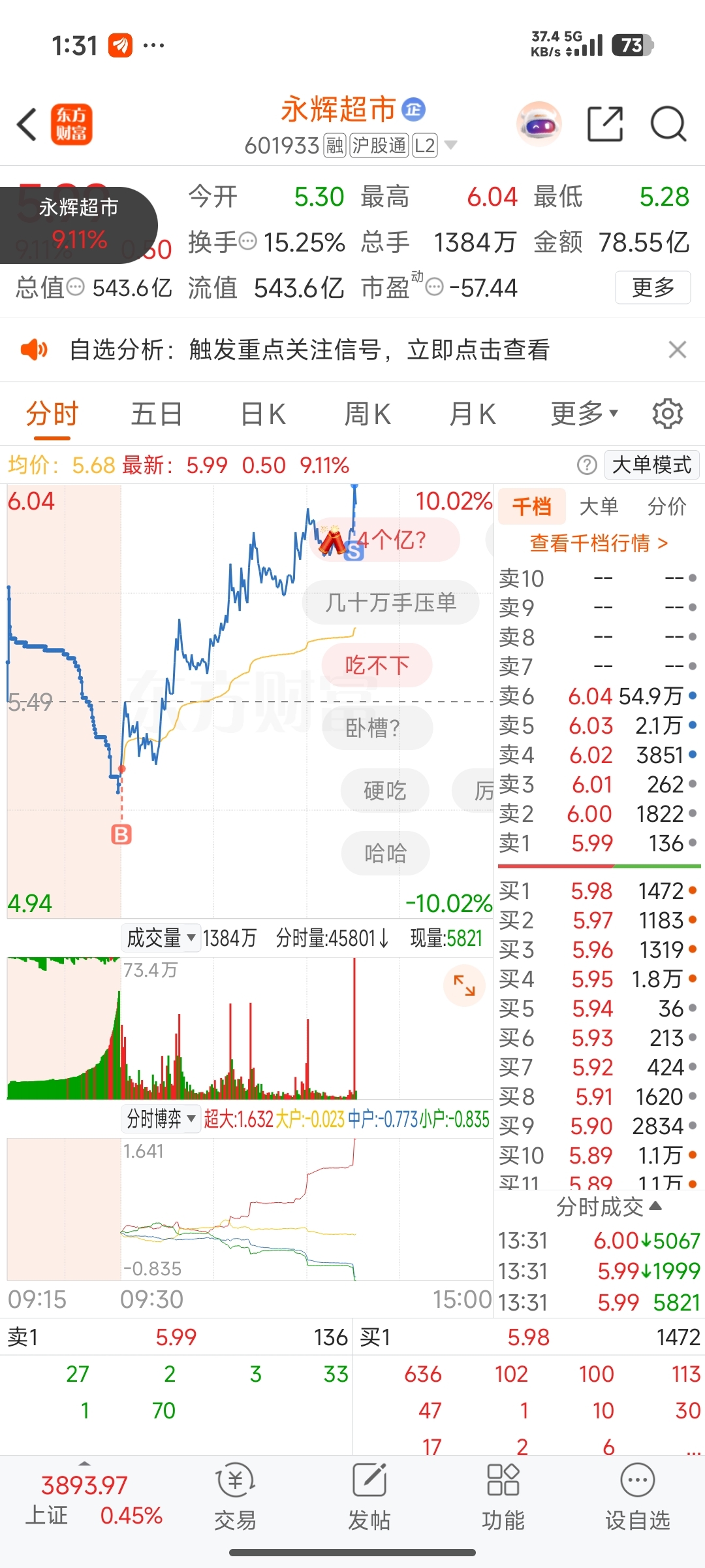 今天的任务完成了,永辉今天还会涨停的,先把早上加的t出来