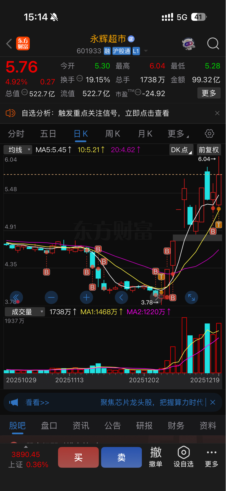 永辉这只票持仓很久了,只买不卖,一度仓位来到93%,我原本是计划7元清仓,今天纠