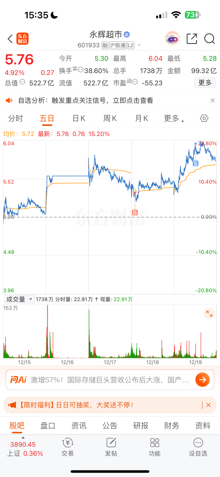 $永辉超市(SH601933)$ 龙头就是龙头,十几个点