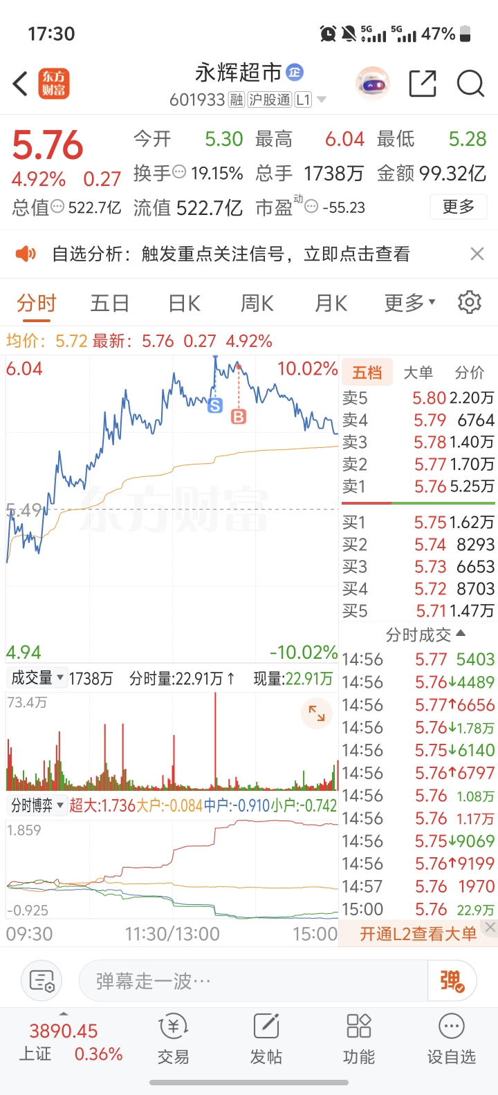$永辉超市(SH601933)$ 板上卖了,过了会看到要封板又6块钱买回了半仓,下周一如果低开3个点就全仓干,本来这个月前面半个月亏快20个点的,全靠永辉这个月翻红了,后面几天就躺这了