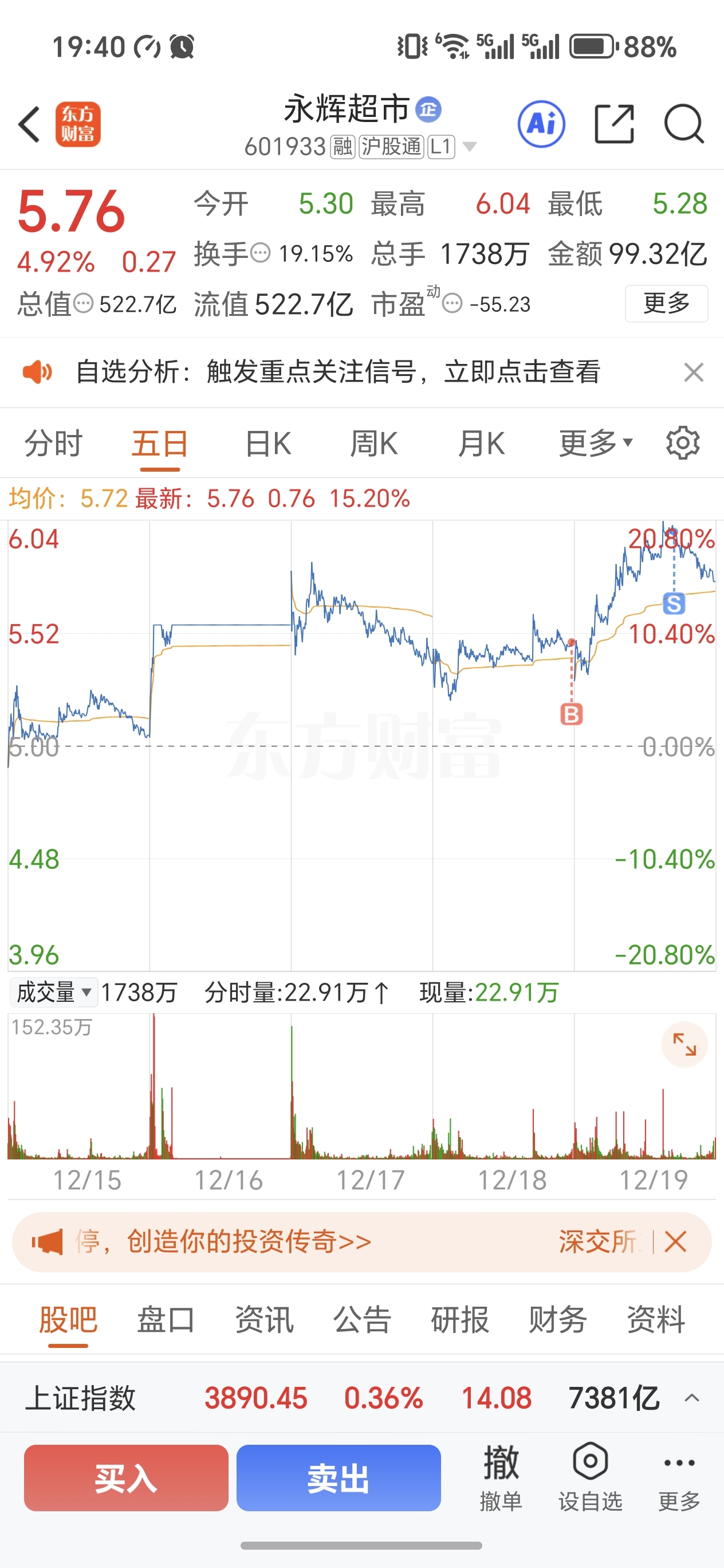 $永辉超市(SH601933)$ 昨天尾盘接,今天出来