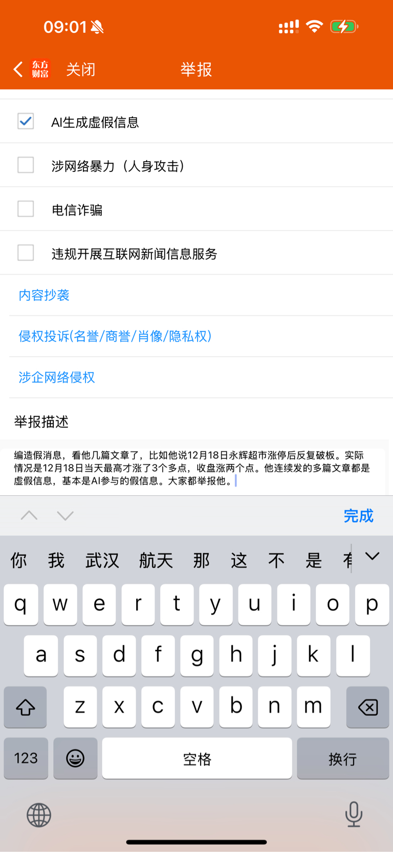 编造假消息,看他几篇文章了,比如他说12月18日永辉超市涨停后反复破板。实际情况是12月18日当天最高才涨了3个多点,收盘涨两个点。他连续发的多篇文章都是虚假信息,基本是AI参与的假信息。大家都举报他。