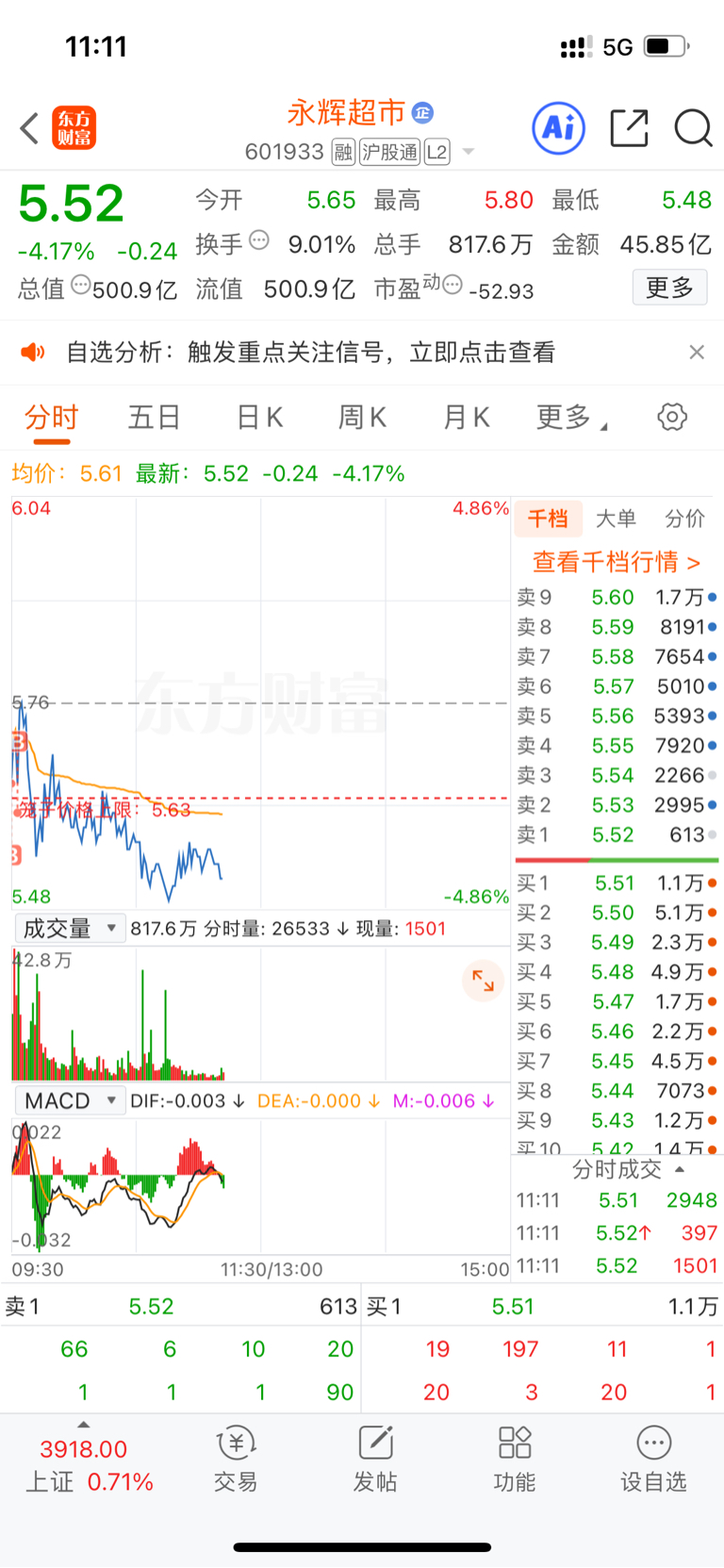 $永辉超市(SH601933)$ 周末分析了两天,早上高高兴兴的冲进来接盘,现在有点心情不好。