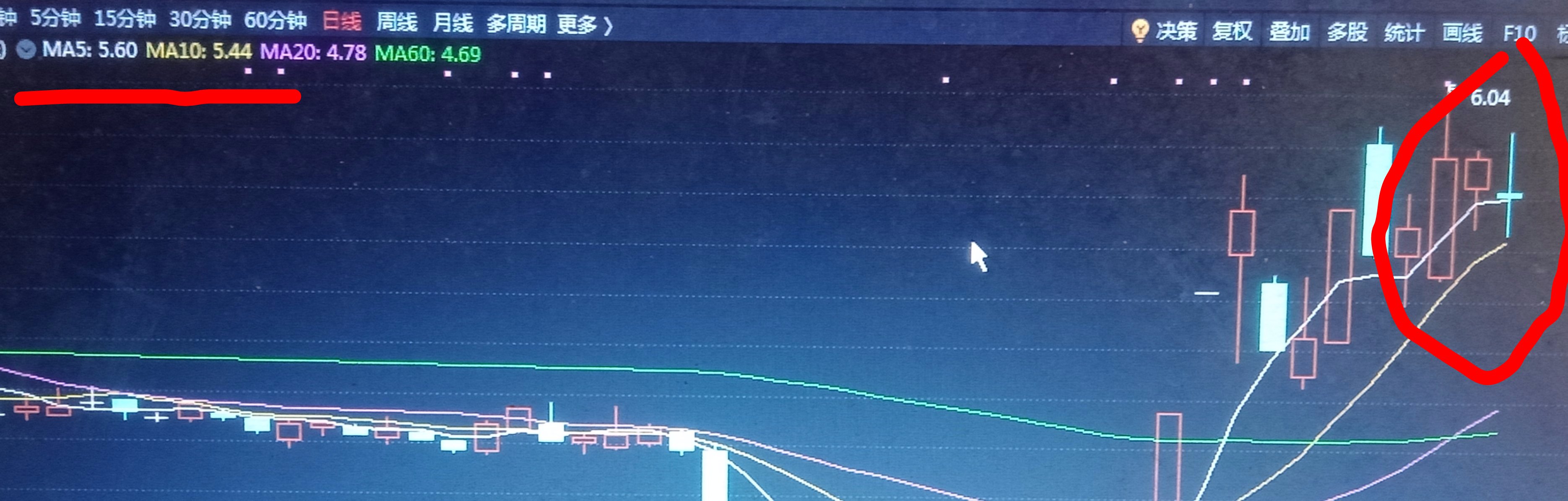 我加仓在五日均线5.60以上,今天已经回踩过10日均线5.44附近过了。所以我加仓搏一搏后续的行情。操作短线的人去看住10日均线5.44,不能让他下破,下破10均线5.44那么就要大幅度减仓或者先离开。请勿跟风操作。操作手法个人不一样的。