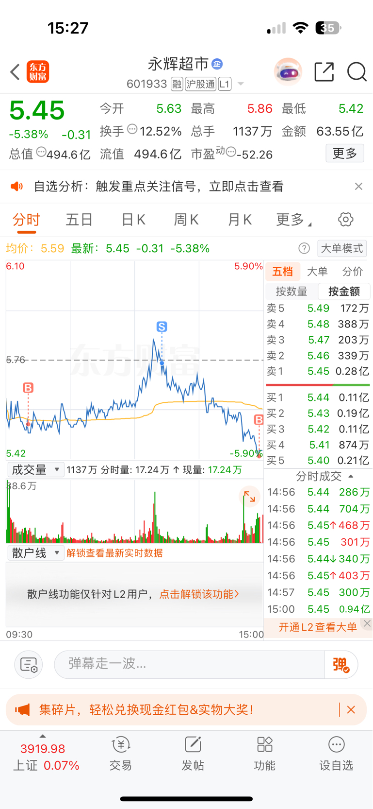 $永辉超市(SH601933)$ 明天给老子涨停