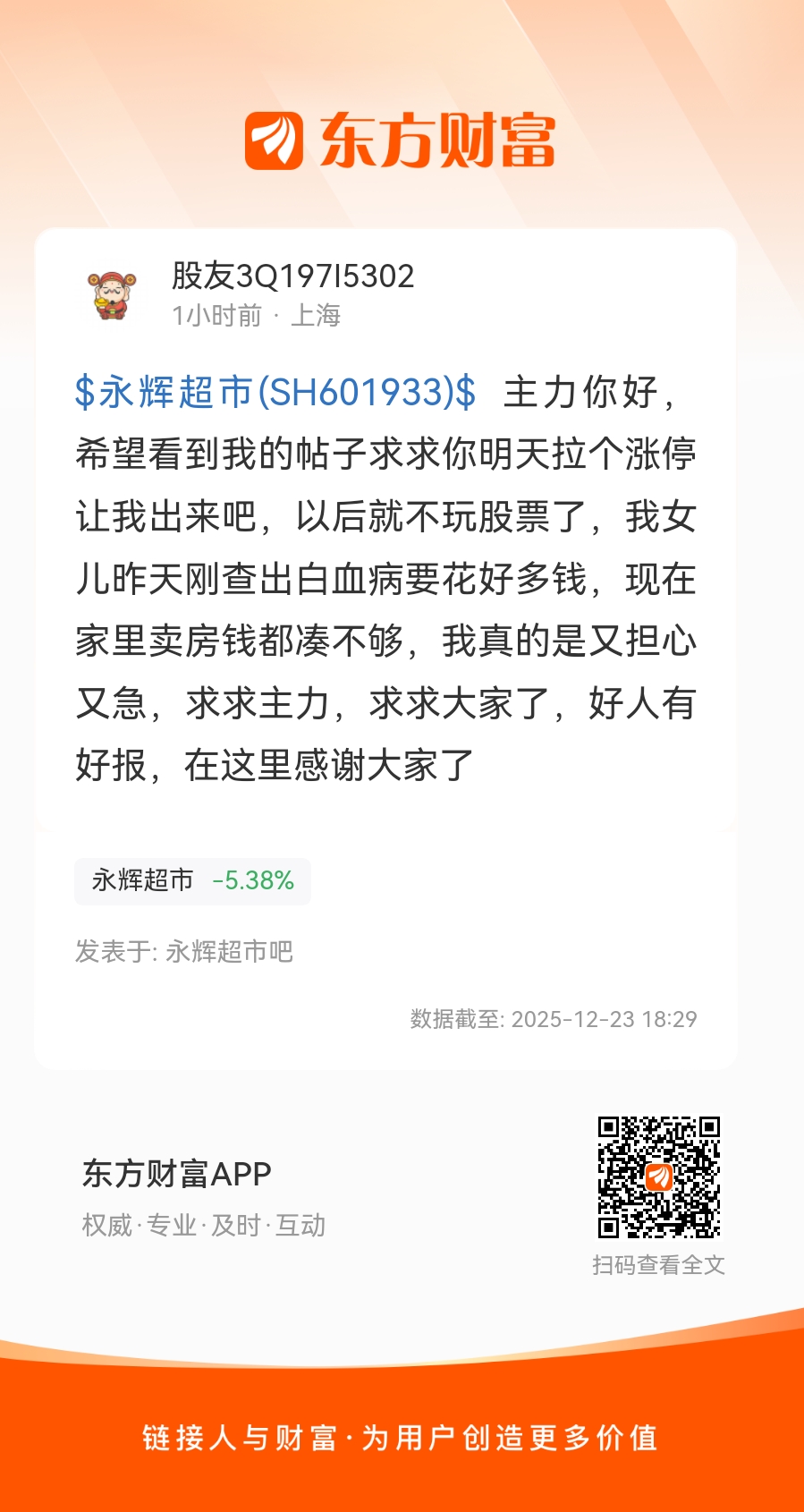 $永辉超市(SH601933)$  主力你好,希望看到我的帖子求求你明天拉个涨停让我出来吧,以后就不玩股票了,我女儿昨天刚查出白血病要花好多钱,现在家里卖房钱都凑不够,我真的是又担心又急,求求主力,求求大家了,好人有好报,在这里感谢大家了