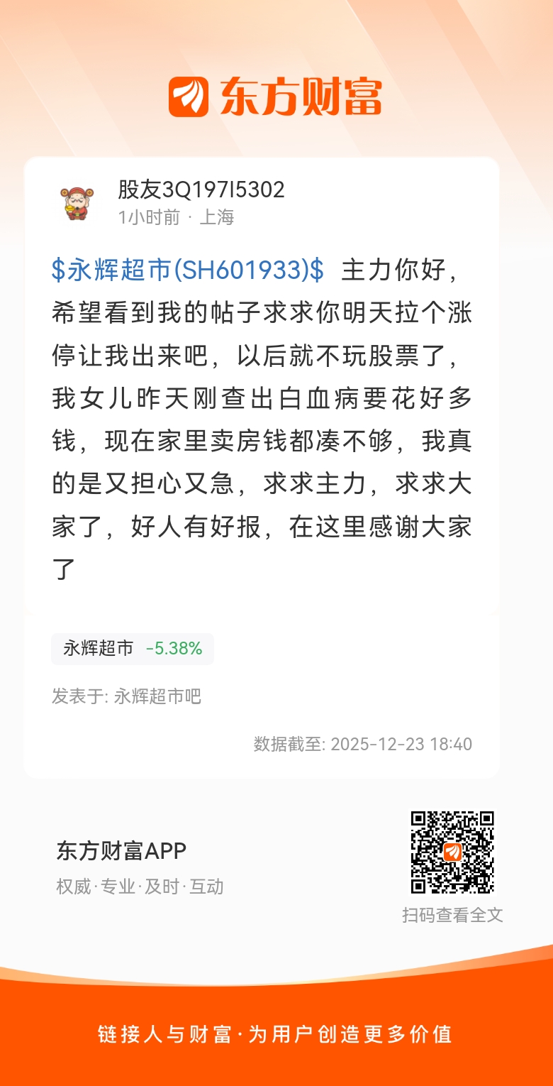 $永辉超市(SH601933)$  主力你好,希望看到我的帖子求求你明天拉个涨停让我出来吧,以后就不玩股票了,我女儿昨天刚查出白血病要花好多钱,现在家里卖房钱都凑不够,我真的是又担心又急,求求主力,求求大家了,好人有好报,在这里感谢大家了