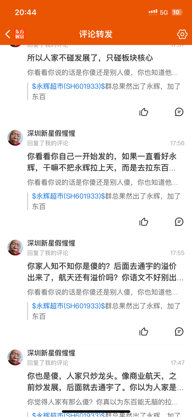 $永辉超市(SH601933)$ s,b出来,我就非要跟你杠下了,航天发展和通宇通讯谁是板块核心都搞不懂的s,b你还装上了,你那么厉害你拉黑我干啥s,b