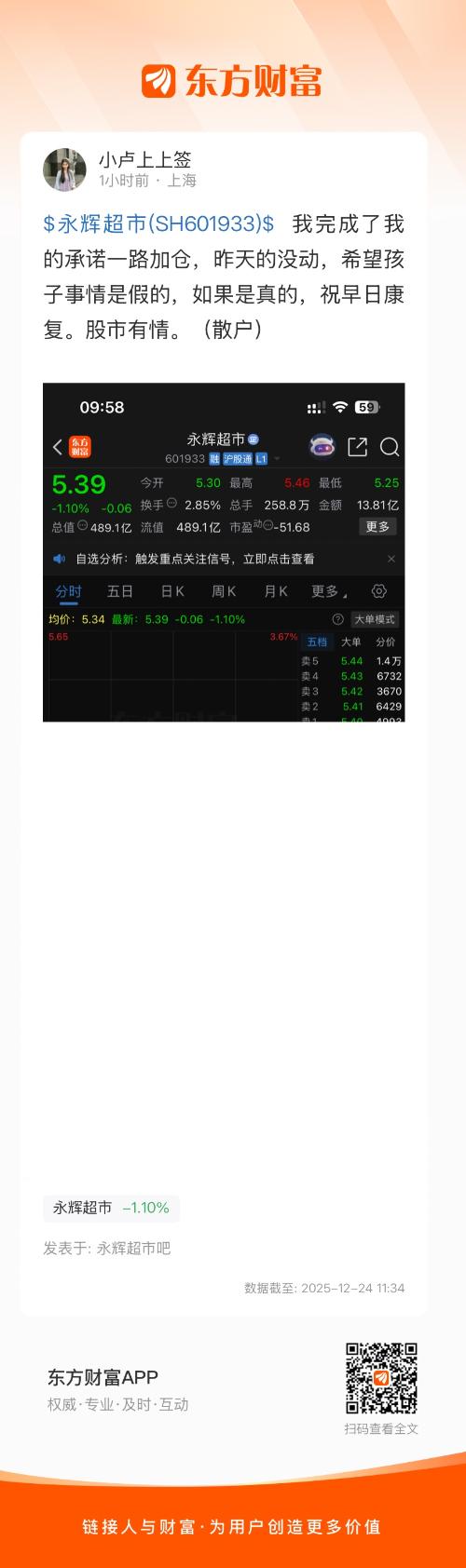 $永辉超市(SH601933)$ 我完成了我的承诺一路加仓,昨天的没动,希望孩子事情是假的,如果是真的,祝早日康复。股市有情。(散户)