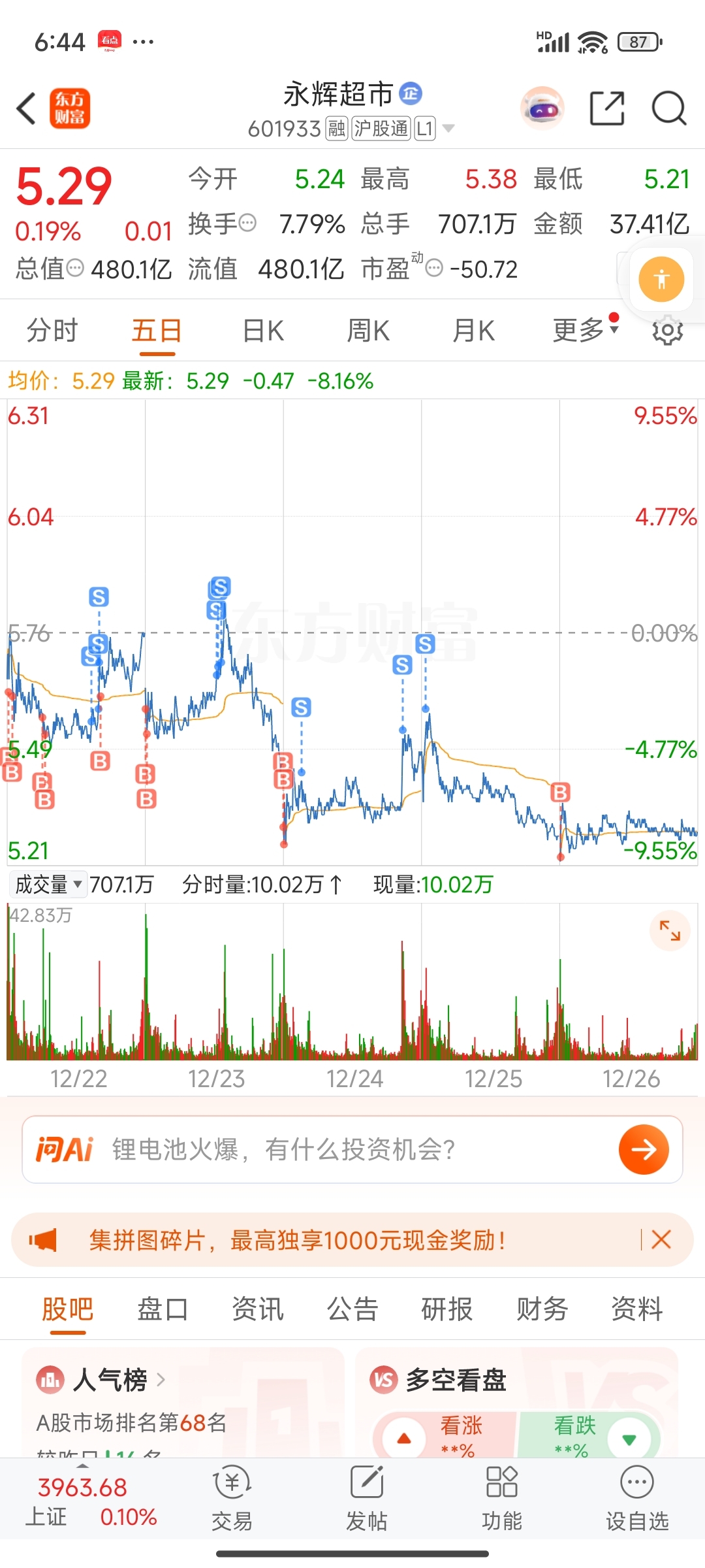 $永辉超市(SH601933)$ 不抛弃,不放弃,前段抽资金去做了东百百大,但感觉那两个快到头了,还是回归大本营永辉更安全!