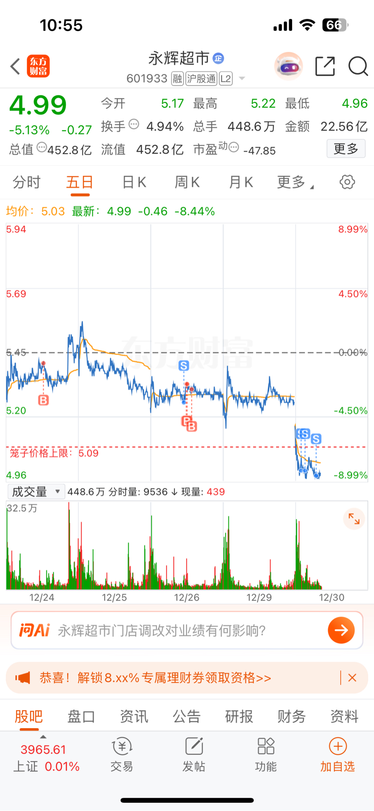 $永辉超市(SH601933)$ 昨天冲高回本了没卖,后悔啊,割肉走了