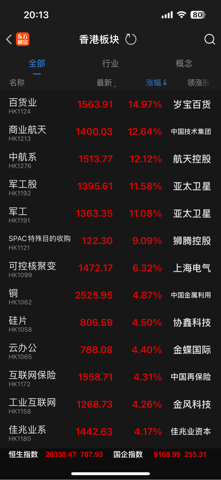 香港消费百货板块暴涨,涨幅第一!商业航天第二!坐等大消费开年一路长虹到年底!