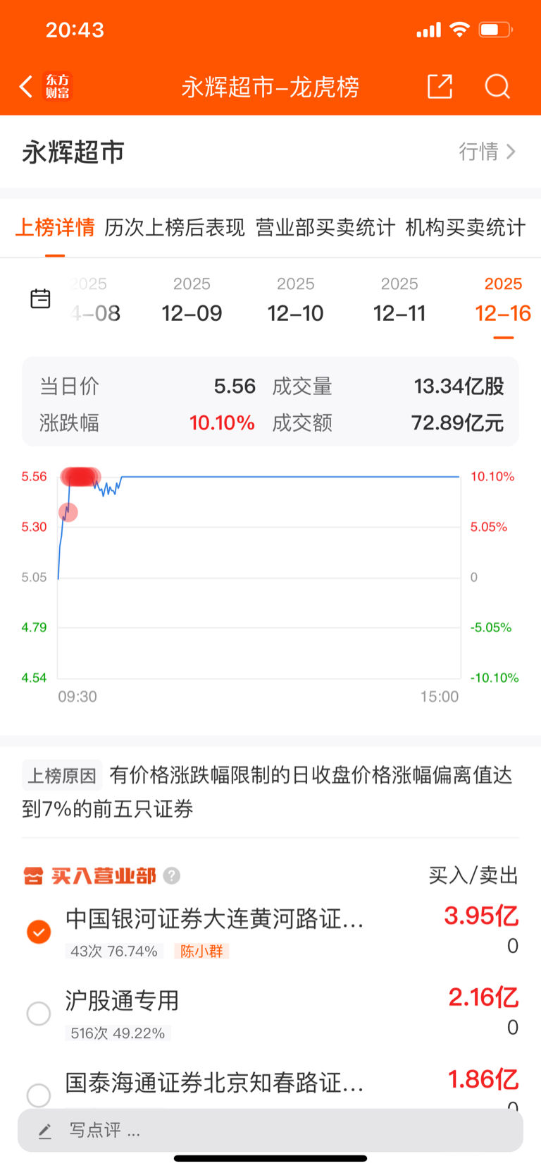 如图所示,去年12月16日的龙虎榜上陈小群赫然在列。这位著名游资的成功秘诀几乎人尽皆知,那就是只做龙头不做杂毛…