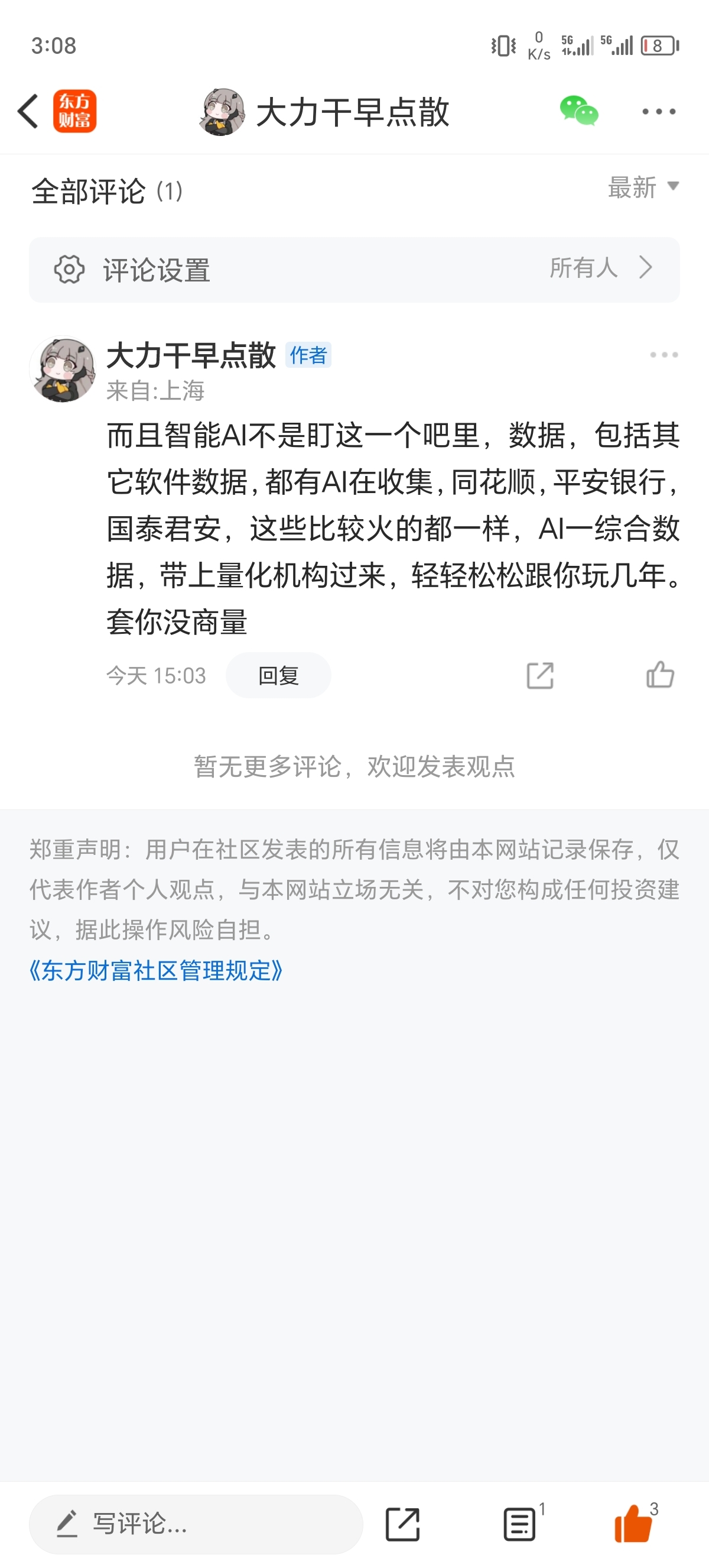 温馨提示: 1.根据《证券法》规定,禁止编造、传播虚假信息或者误导性信息,扰乱证券市场;2.用户在本社区发表的所有资料、言论等仅代表个人观点,与本网站立场无关,不对您构成任何投资建议。用户应基于自己的独立判断,自行决定证券投资并承担相应风险。《东方财富社区管理规定》