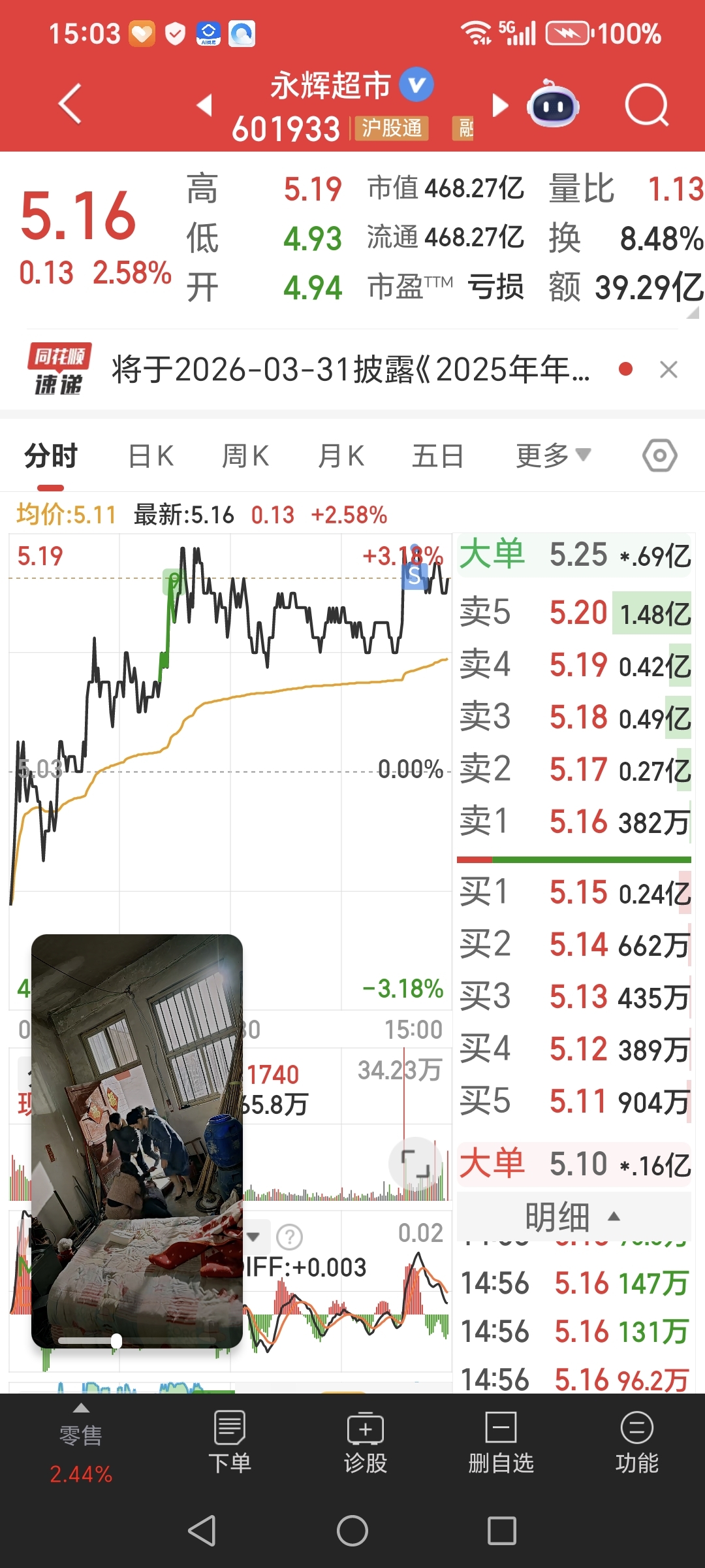 $永辉超市(SH601933)$ 今天5.18卖掉半仓,周一见