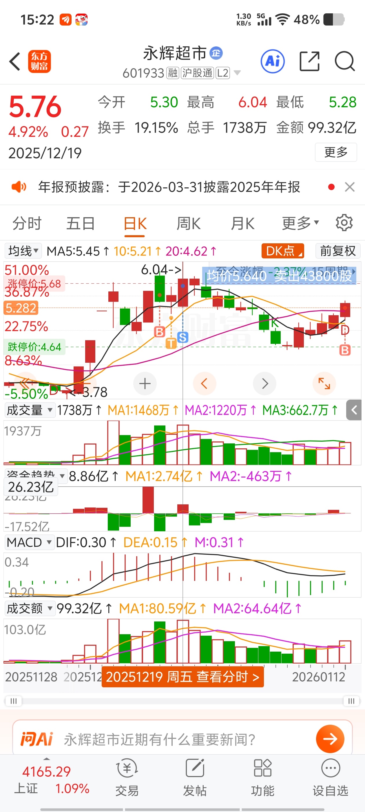 43800股,没有卖在6.04最高点少赚好几万没了,不过后面也跌下来了今天第二次