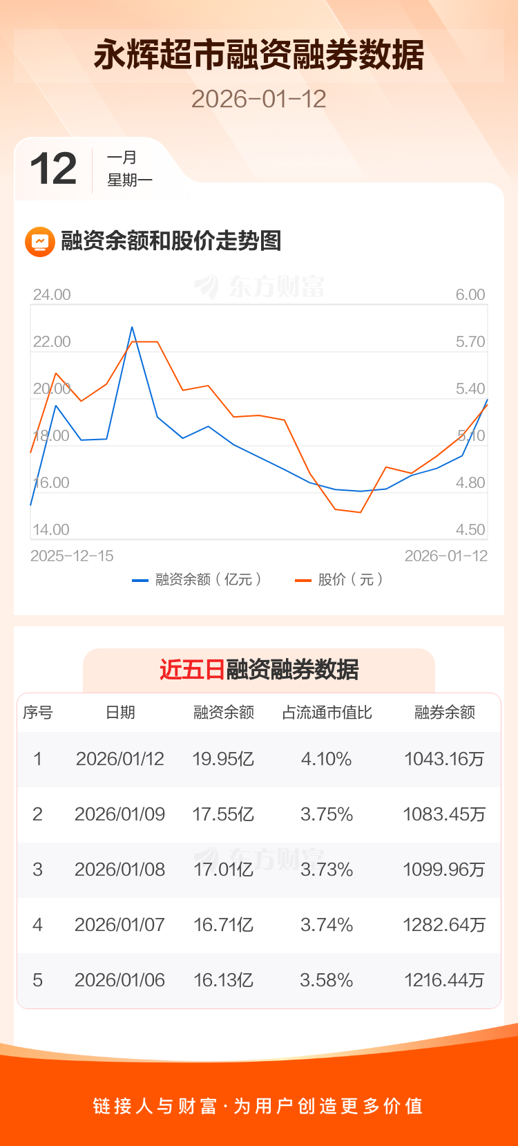 交易所最新数据显示,永辉超市于2026年1月12日获融资买入5.74亿元,融资偿还3.34亿元,当日融资净买入2.4亿元。目前,该股融资余额19.95亿,占流通市值比例为4.10%。