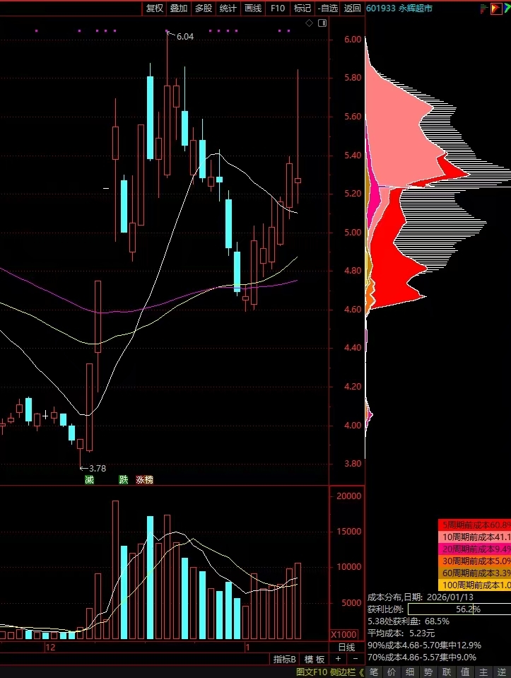 $永辉超市(SH601933)$ 看看这个筹码峰,今天很多前面套牢盘解套出货了,需要明天放量冲一下,新接盘资金就疯狂进来,这周比较关键。