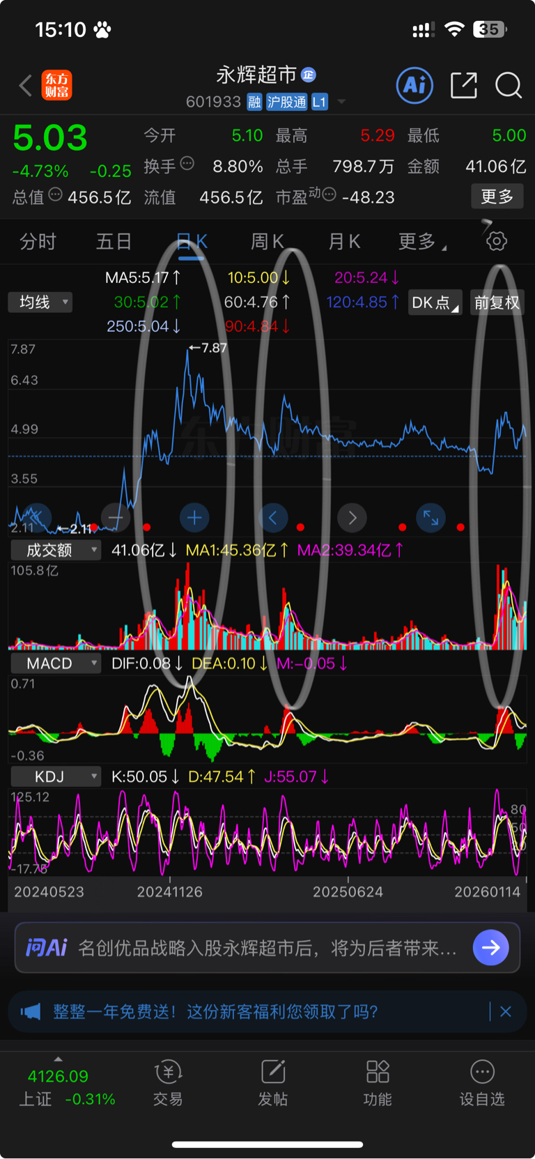 $永辉超市(SH601933)$ 堆量放量就是大顶,就是很多人喜欢做梦,永辉超市现实中什么样大家心知肚明,上了五百亿市值你还想它再往上涨,这是实体超市不是科技股,市值需要好的业绩支撑的,不像科技股可以乱炒,今天的走势已经明确了昨天的拉高出货套人走势,散户又成功接盘了,接下来就是几根中阴线后的阴跌走势