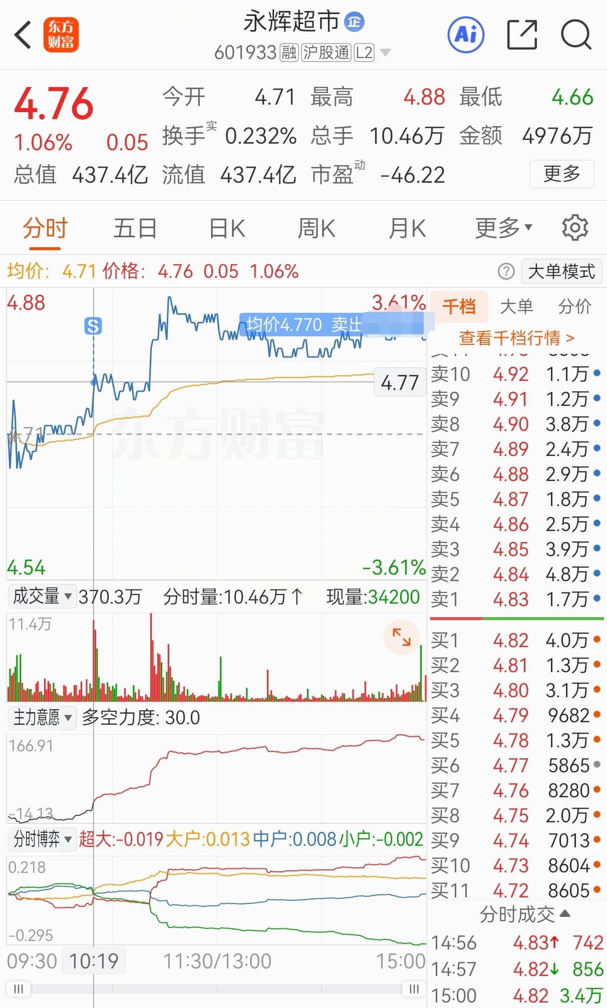 今买明卖,4.71买,4.77卖,实盘隔夜套利永辉超市,成功收米走人!