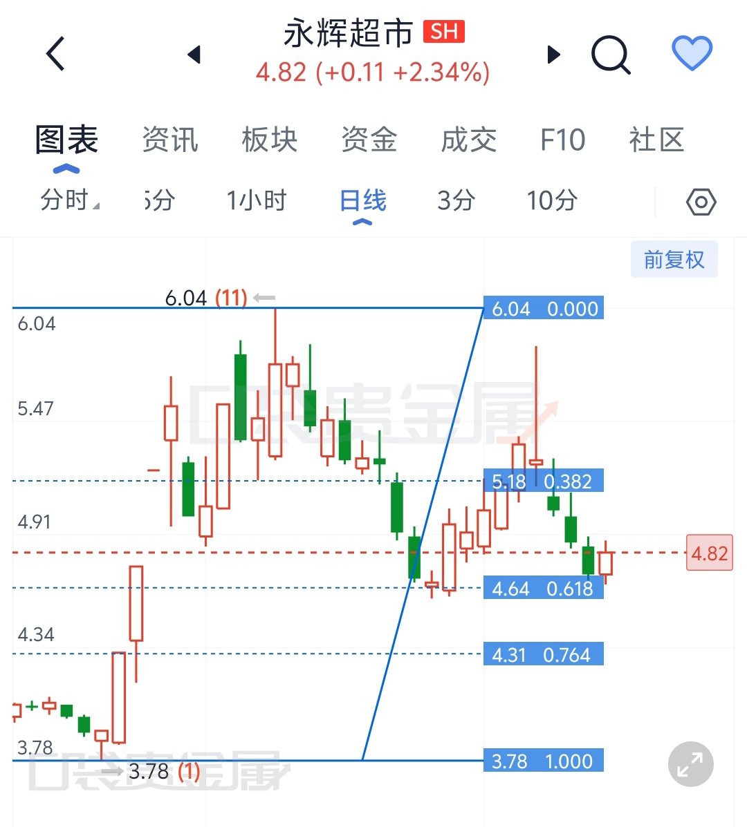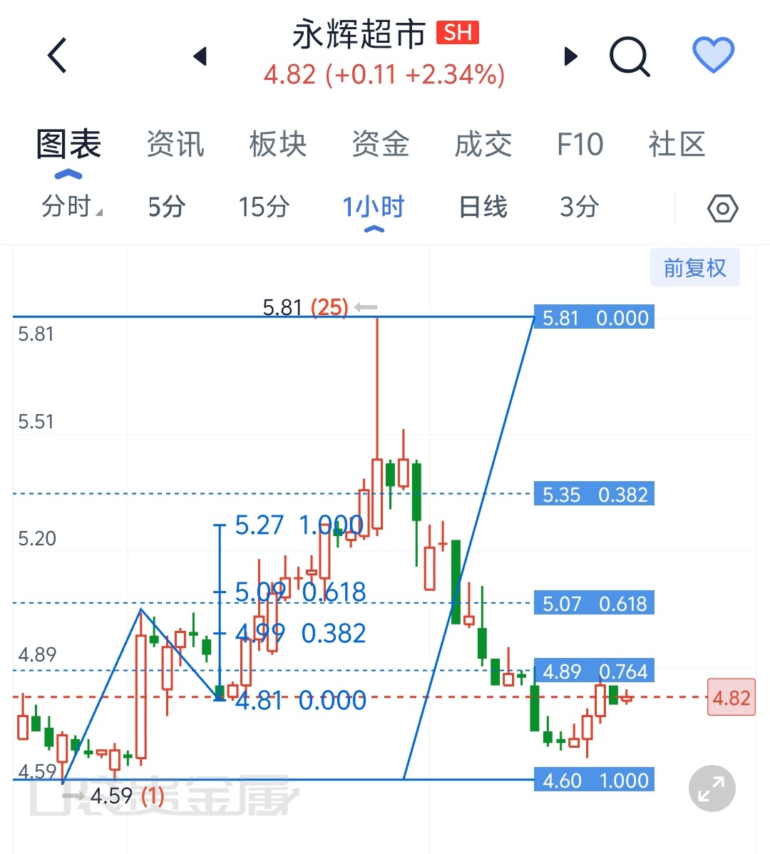 之前从4.59上涨到5.81的这段上涨的结构已经被破坏,今天下跌中打到了日线级别的重要支撑位黄金分割的0.764位置出现了反弹,反弹的力度不是很强,量能不够,看明天如果能继续向上反弹,看力度,如果收盘能站上5.18,那可能要去挑战5.81前高了。