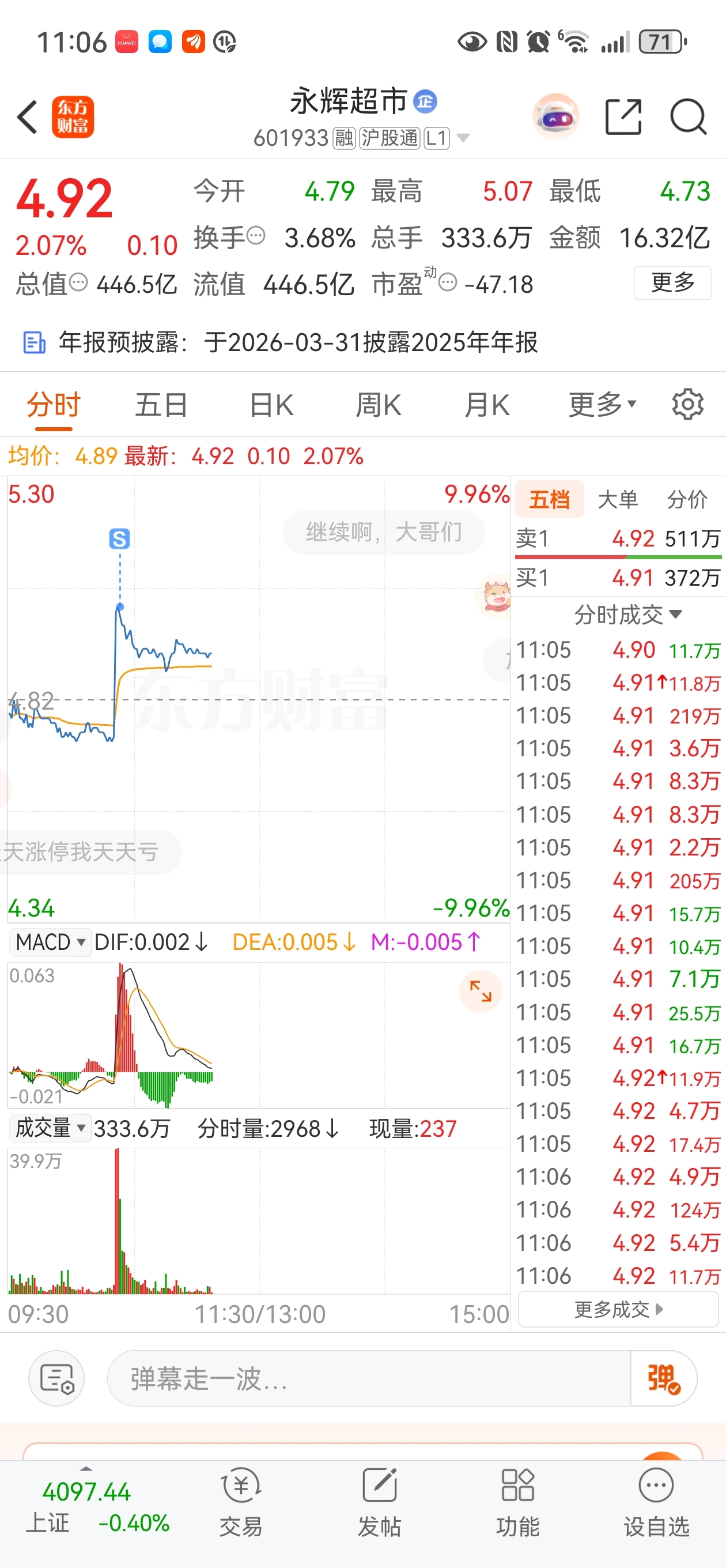 $永辉超市(SH601933)$ 还好跑得快,等一下看有没有优惠价格,涨停了就算了