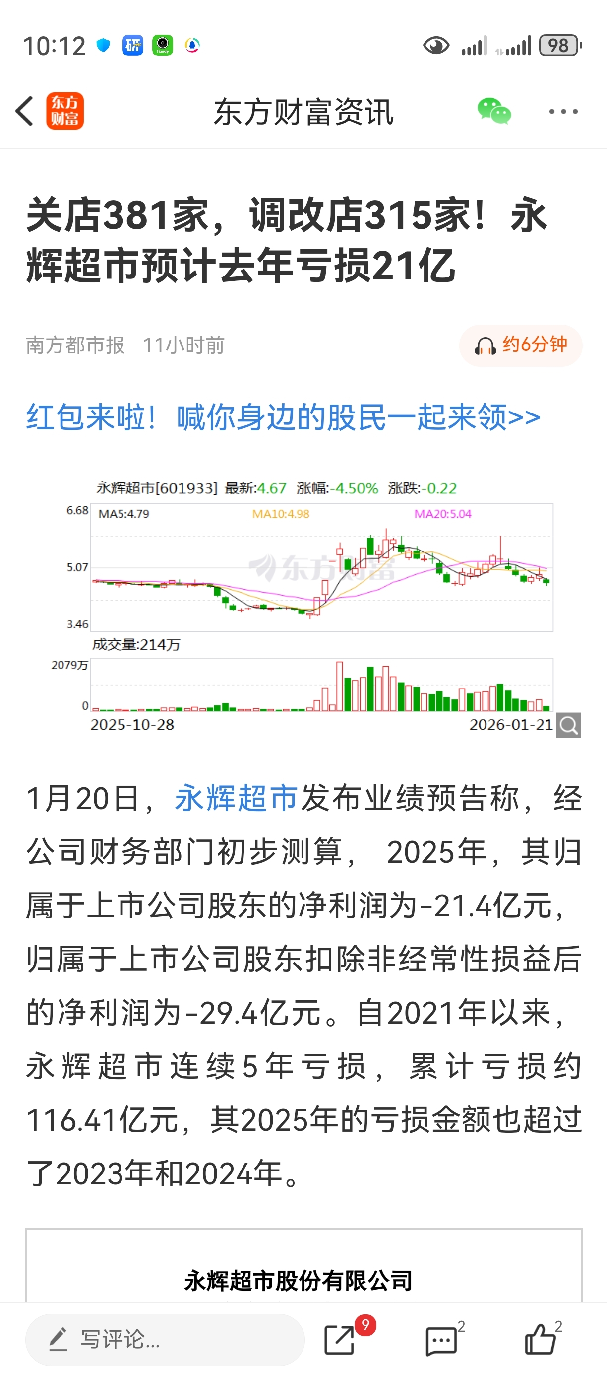$永辉超市(SH601933)$ 多了不说了,止损吧,别乱听狗托的盲目抄底,选点靠谱的票,St就什么都晚了