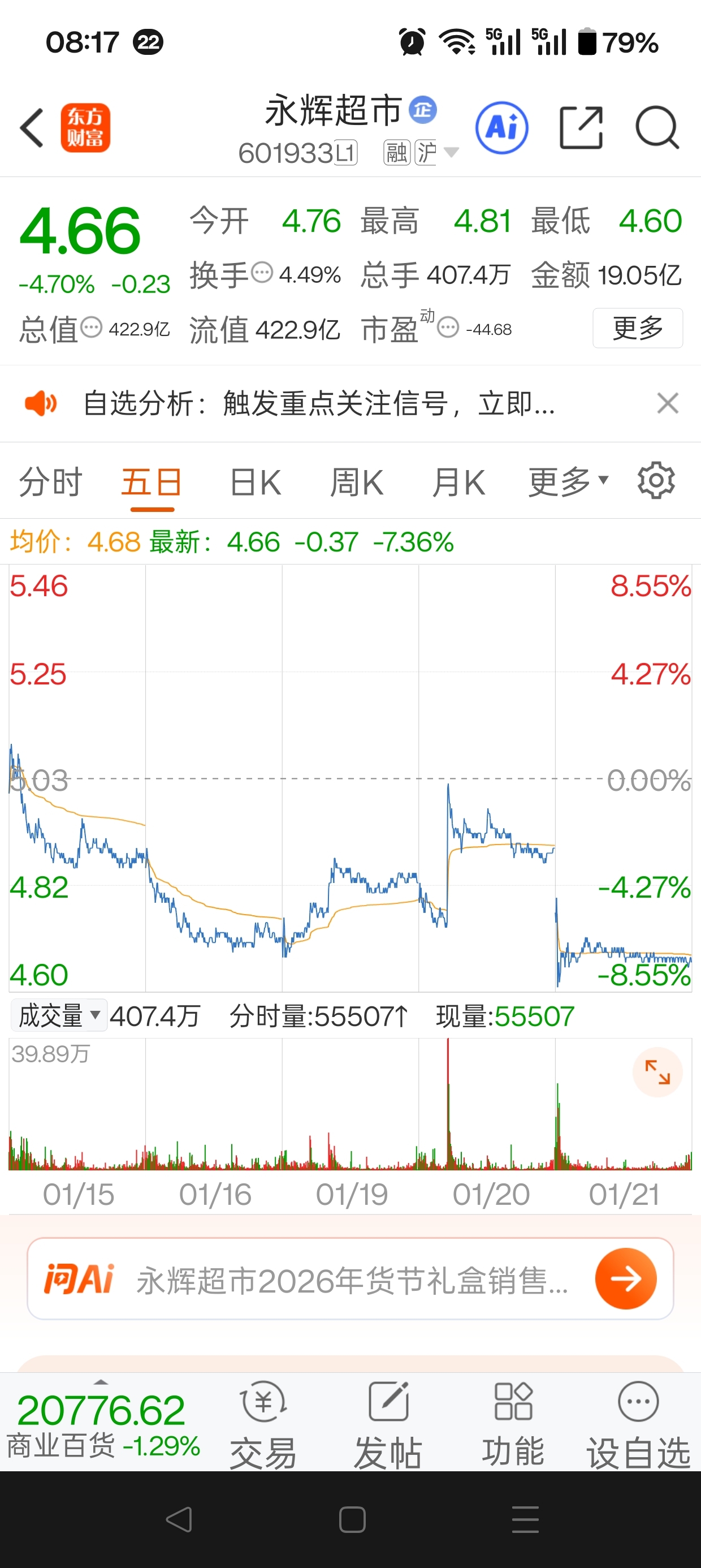 $永辉超市(SH601933)$ 经常听说股市里一致转分歧,分歧转一致。前天昨天的走势很好的诠释了这个说法。昨天就是标准的一致看法走势,今天必将出现分歧走势。低开,一路南下下跌,跌到你找不着北,然后股价迅速北上,盘中极速震荡,全天股价在哪里黄色均价线上方运行。收盘跌三个点。