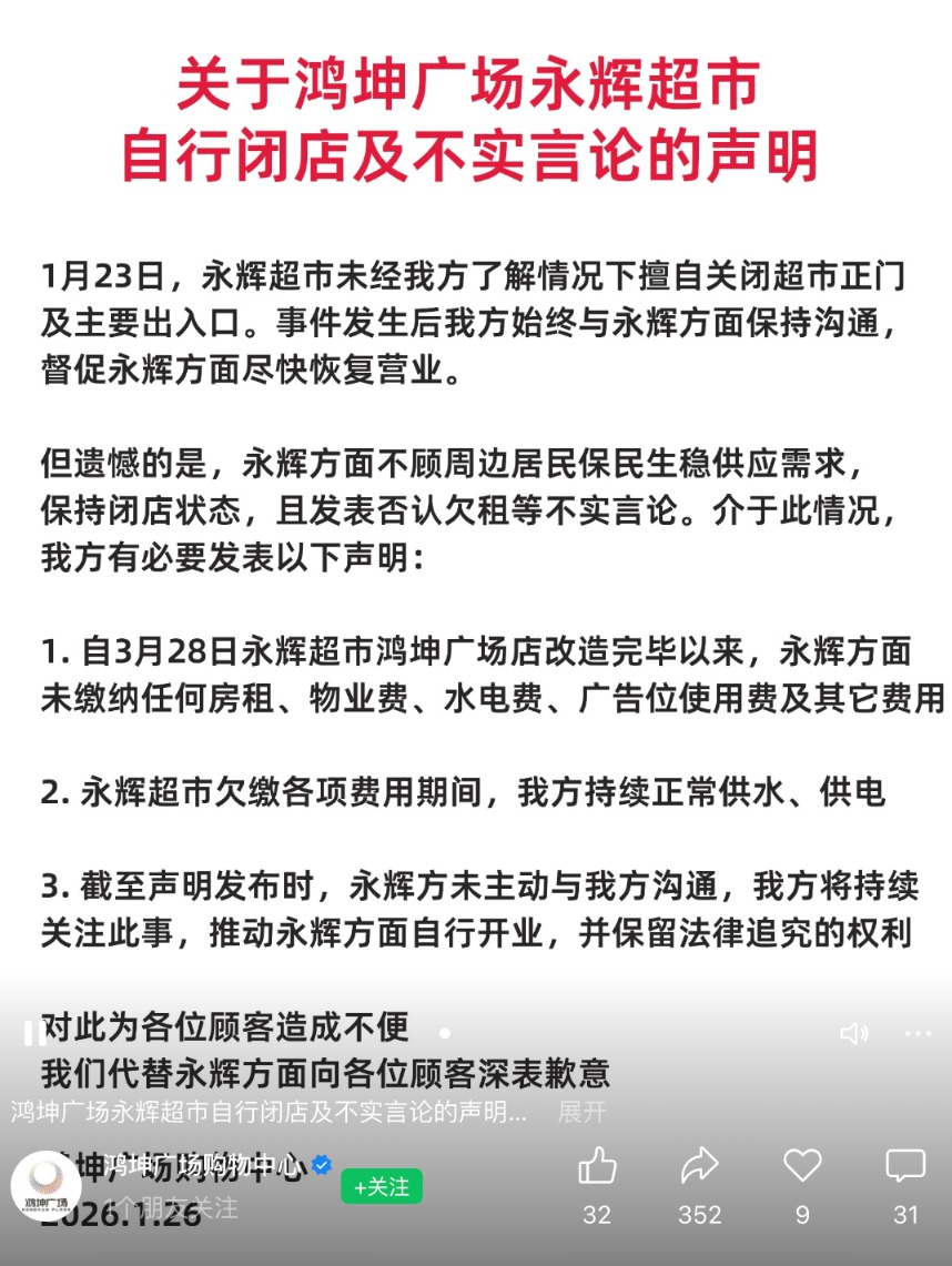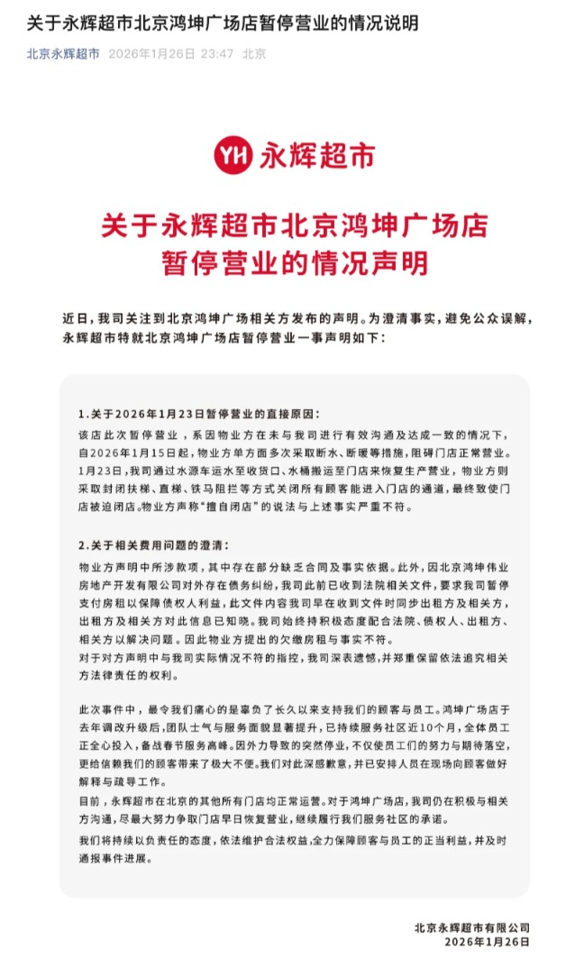 1月26日深夜,北京永辉超市就鸿坤广场店暂停营业一事发布声明称,该店此次暂停营业,系因物业方在未与公司进行有效沟通及达成一致的情况下,自2026年1月15日起,物业方单方面多次采取断水、断暖等措施,阻碍门店正常营业。1月23日,公司通过水源车运水至收货口、水桶搬运至门店来恢复生产营业,物业方则采取封闭扶梯、直梯、铁马阻拦等方式关闭所有顾客能进入门店的通道,最终致使门店被迫闭店。物业方声称“擅自闭店”的说法与上述事实严重不符。