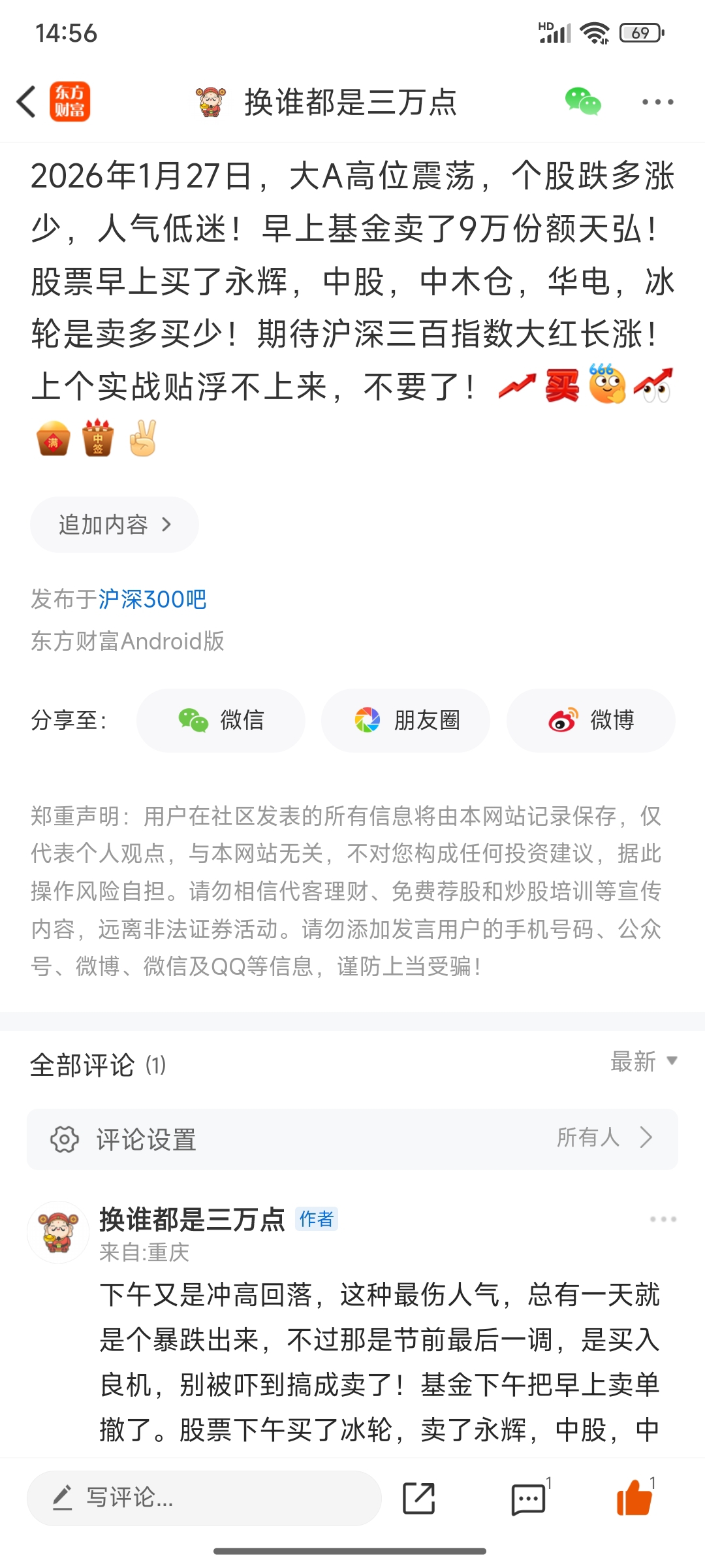 温馨提示: 1.根据《证券法》规定,禁止编造、传播虚假信息或者误导性信息,扰乱证券市场;2.用户在本社区发表的所有资料、言论等仅代表个人观点,与本网站立场无关,不对您构成任何投资建议。用户应基于自己的独立判断,自行决定证券投资并承担相应风险。《东方财富社区管理规定》