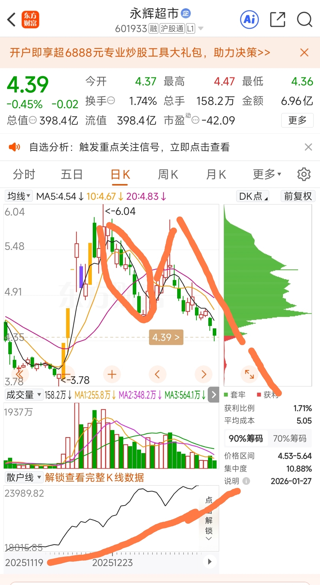$永辉超市(SH601933)$ 看筹码峰套牢盘越来越多!机构主力都走了!剩下烂摊子自相残杀股价只能越来越低这就是主力与机构看到结果!!!