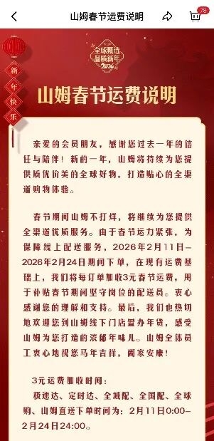 $永辉超市(SH601933)$ 盒马发布春节运费说明称,2月14日至21日,为补贴留岗骑手、保障顺利配送,盒马运费调整为每单基础6元,与往年持平,会员享受运费专属优惠。盒马已提前部署运力,继续提供最快30分钟送达的即时配送服务。与此同时,盒马冷冻年菜配送范围实现重大突破,云享会最北可配送至黑龙江,最南可至海南,配送时效缩短至24-48小时。