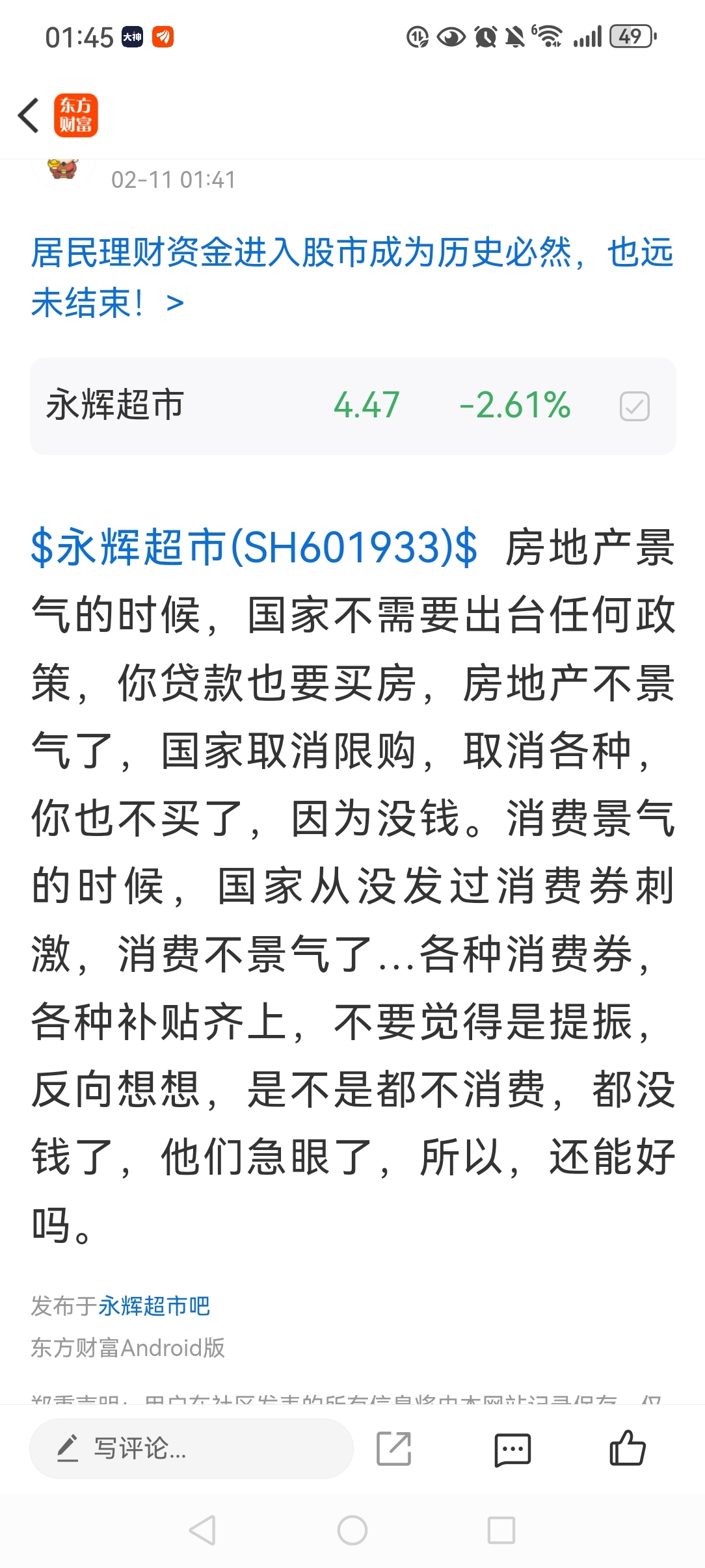 温馨提示: 1.根据《证券法》规定,禁止编造、传播虚假信息或者误导性信息,扰乱证券市场;2.用户在本社区发表的所有资料、言论等仅代表个人观点,与本网站立场无关,不对您构成任何投资建议。用户应基于自己的独立判断,自行决定证券投资并承担相应风险。《东方财富社区管理规定》