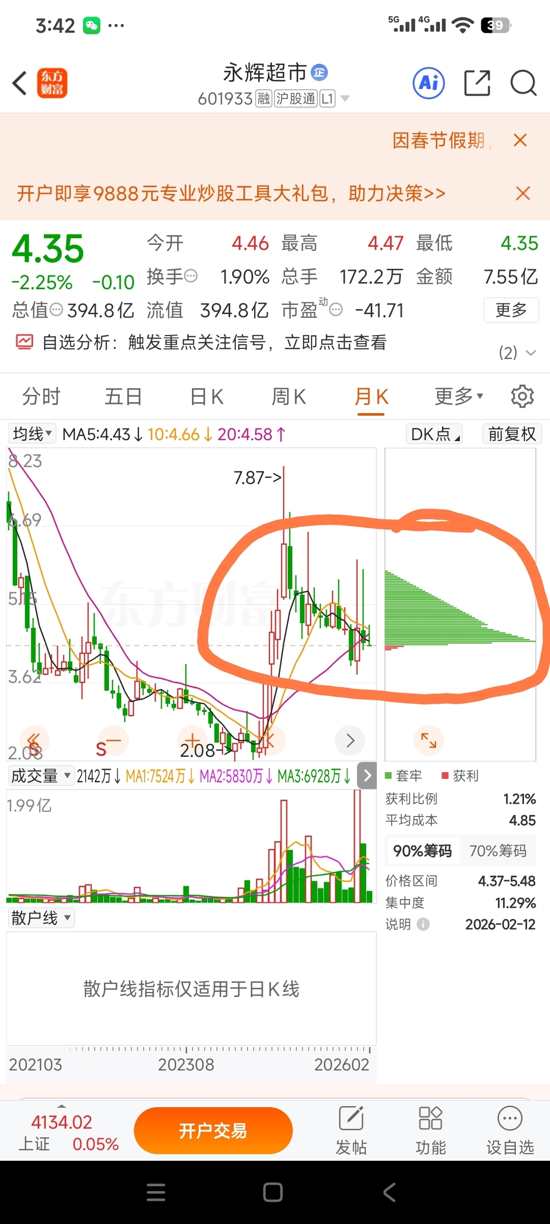 $永辉超市(SH601933)$ 看月线没有一点获利盘!!砸穿会怎么样会不会集体爆仓?!