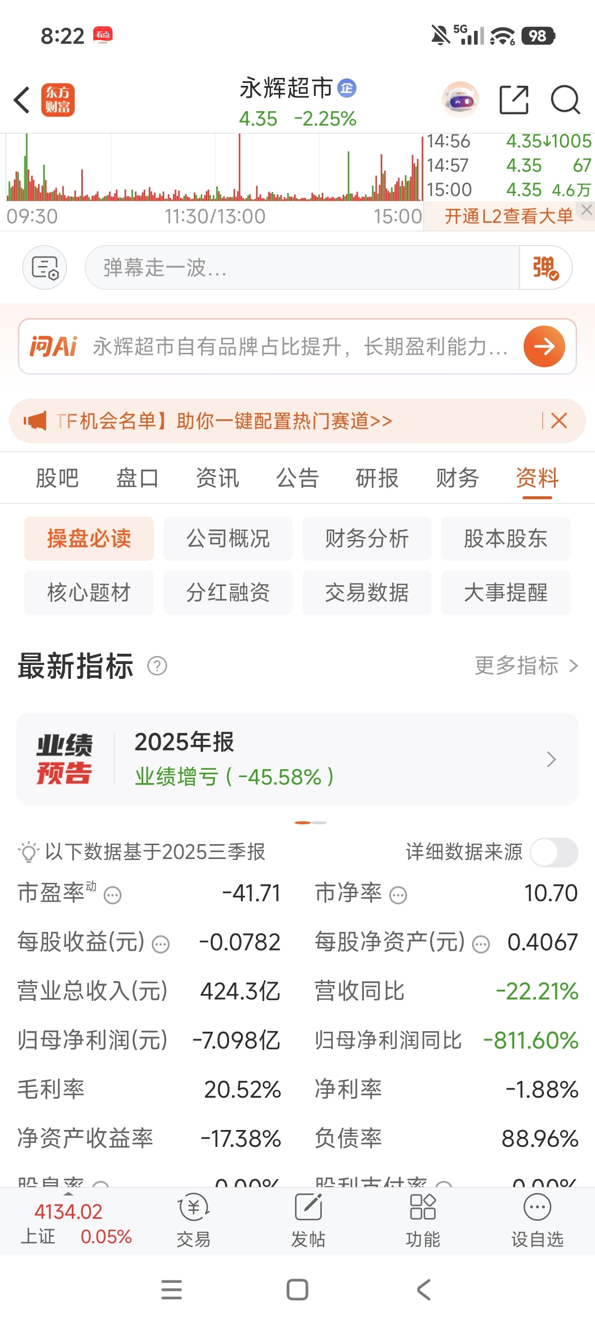 业绩大幅亏损接近百分之五十,大股东集体大幅度抛售股票,融券大资金不断做空永辉,预计今天轻松跌破4,年后3月跌破3,即将进入st行业。