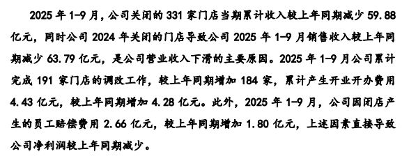 去年,永辉超市累计关闭了381家与公司未来战略定位不相符的门店。资产报废损失、人员优化离职补偿、租赁相关的违约赔偿等直接影响了公司利润水平。永辉超市另一公告显示,2025年前三季度公司累计关闭了331家门店,因闭店产生的员工赔偿费用合计2.66亿元。