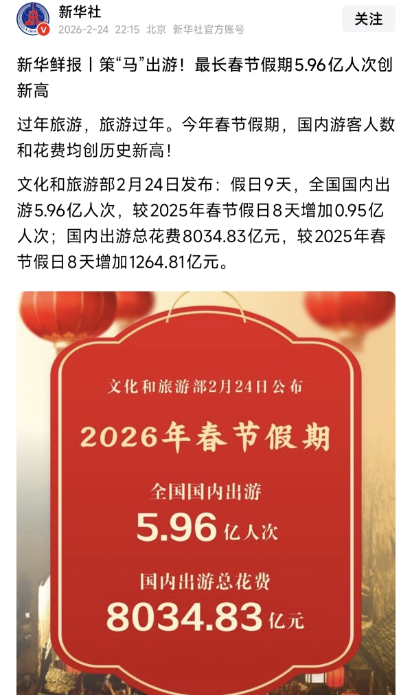 国内出游总花费8034.83亿元,较2025年春节假日8天增加1264.81亿元