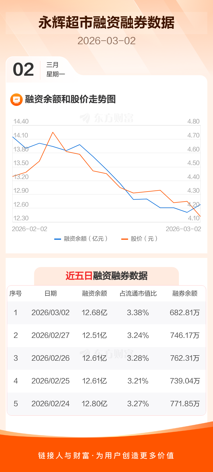 交易所最新数据显示,永辉超市于2026年3月2日获融资买入5146.81万元,融资偿还3434.20万元,当日融资净买入1712.61万元。目前,该股融资余额12.68亿,占流通市值比例为3.38%。