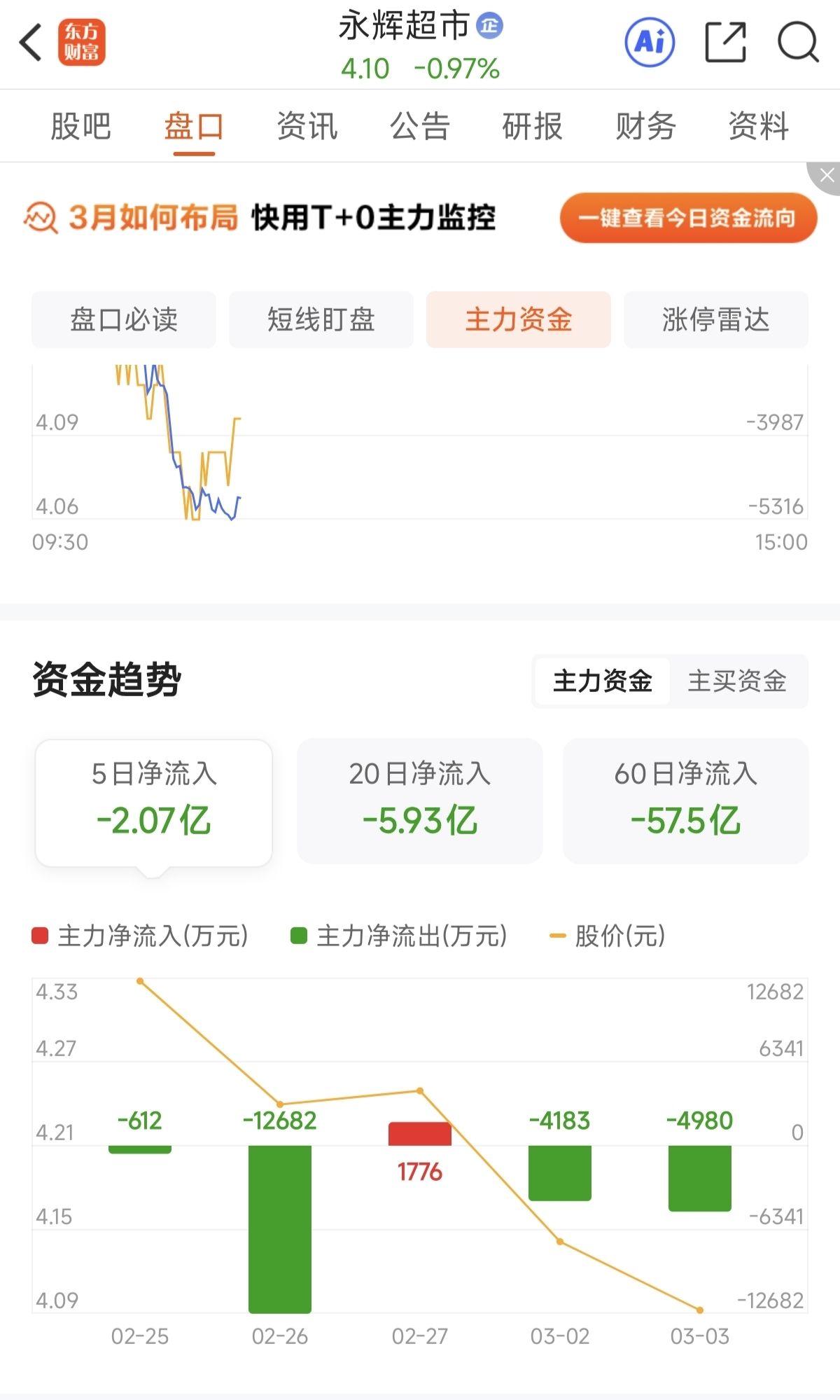 $永辉超市(SH601933)$ 一路不断的创了新低,谁买套谁,资金连续跑了60亿,谁买套谁!