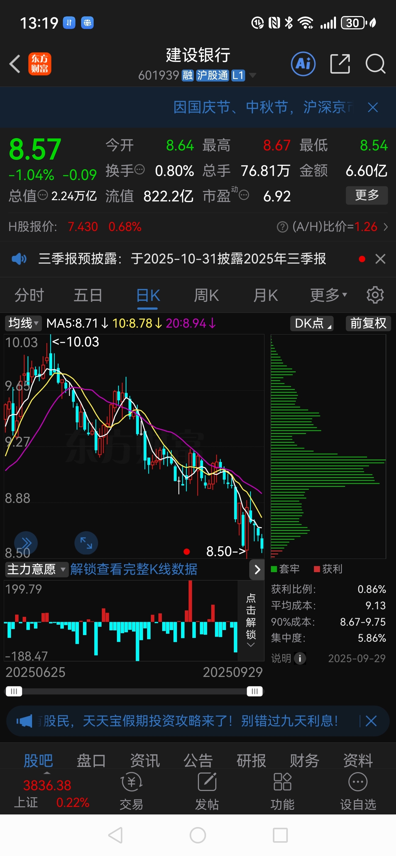 $建设银行(SH601939)$ 还好我的鸡蛋没有放在一个篮子里,不然裤衩都没有了。目前银行股非市场主流,但你也不能这样跌呀。目前食之无味,弃之可惜。