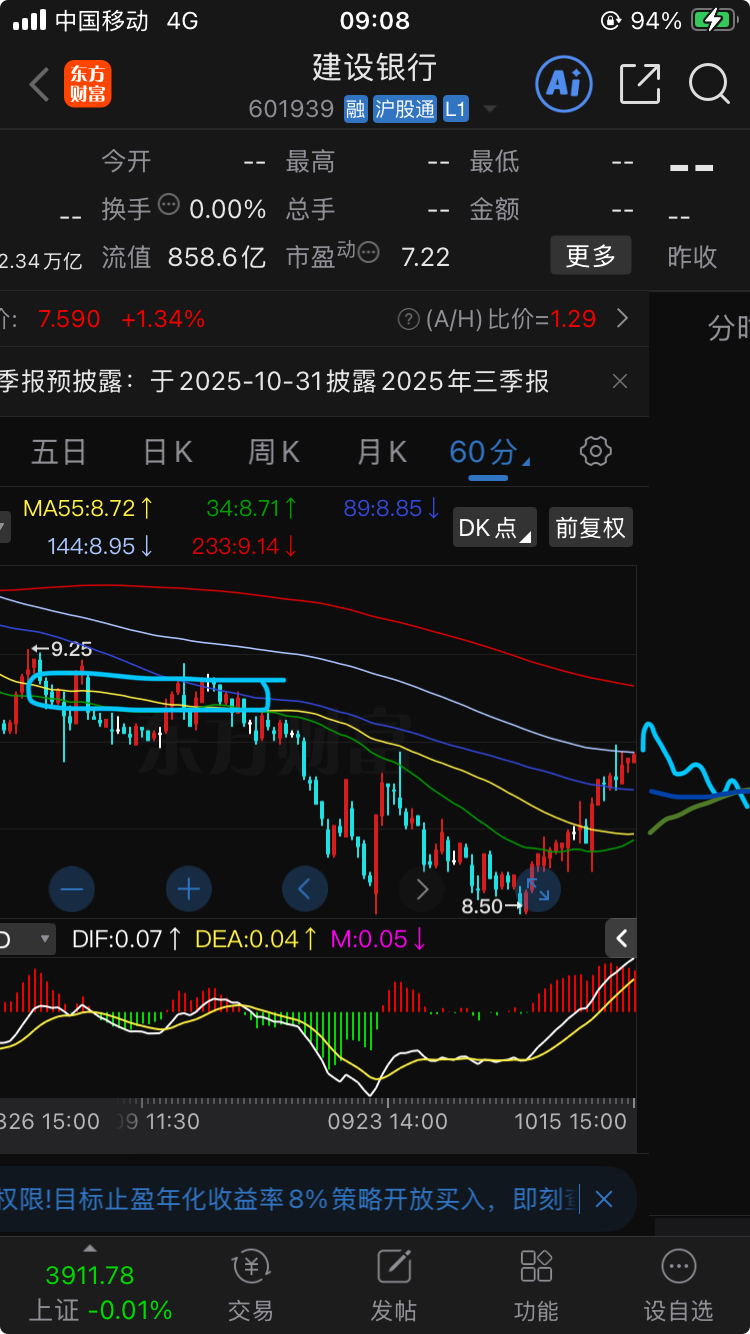 $建设银行(SH601939)$ 60分钟级别长期下跌后第一次反弹到该级别淡蓝色均线,预计今天上午到顶转跌——左侧双头下跌中继平均值在9元多一点点。