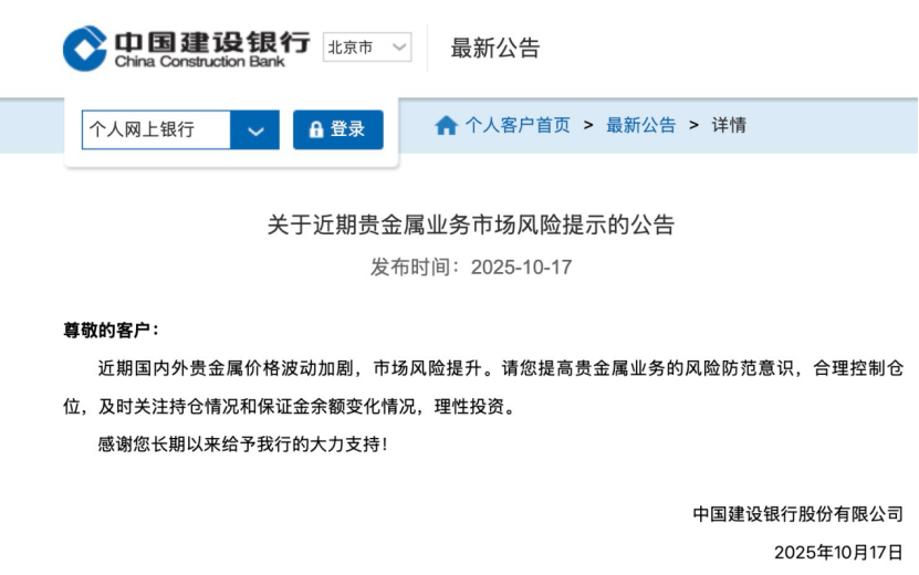 10月17日,建设银行公告称,近期国内外贵金属价格波动加剧,市场风险提升。请您提高贵金属业务的风险防范意识,合理控制仓位,及时关注持仓情况和保证金余额变化情况,理性投资。