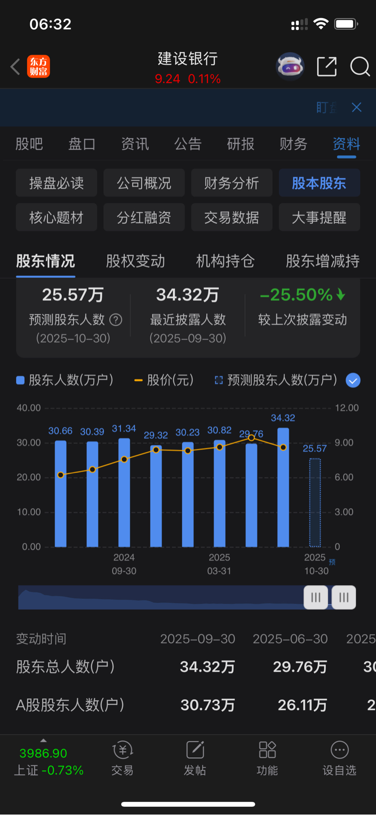 $建设银行(SH601939)$ $建设银行(SH601939)$ 银行股第三季度被减持,建设银行股东人数截止至9月30日达到34.32万人。十月份主力先知先觉进场吸纳筹码,截止至10月30日股东人数只有25.57万人,锐减25.5%